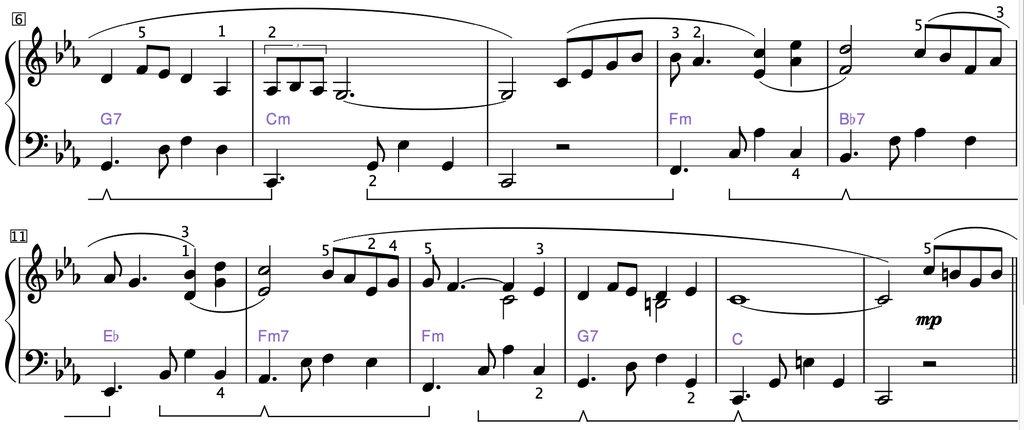 You'll notice that I go back and forth between m. 10 and m. 12, and start adding to them. I extend the measure into the next one by a beat, because we don't want artificial pauses between measures. The last step is m. 9 - 10 and into 11; m. 11-12 into 13.