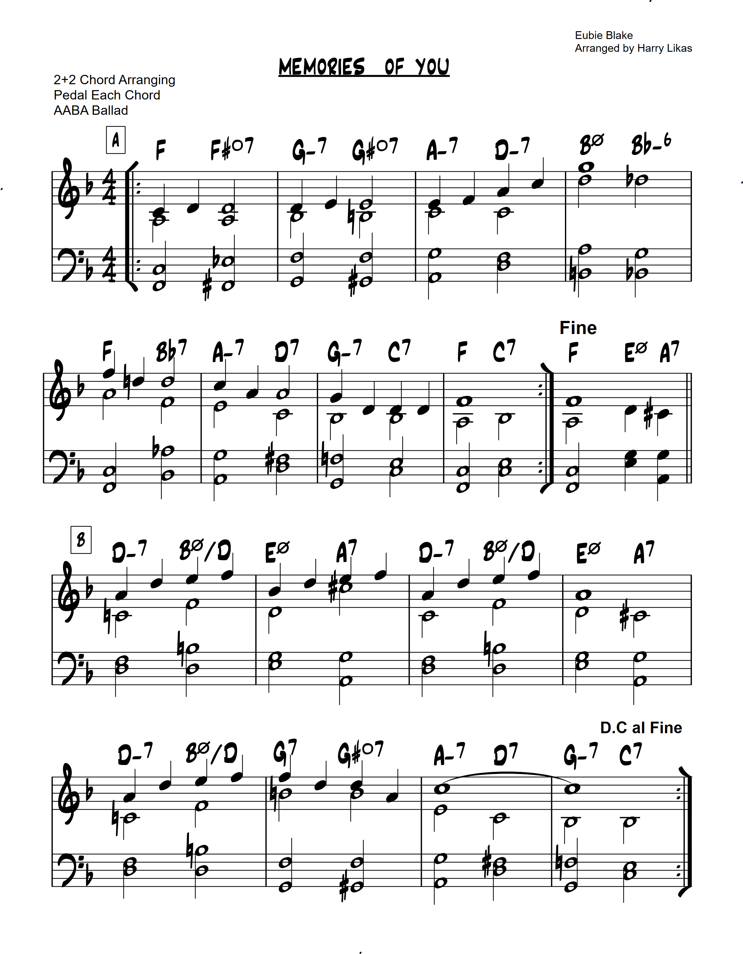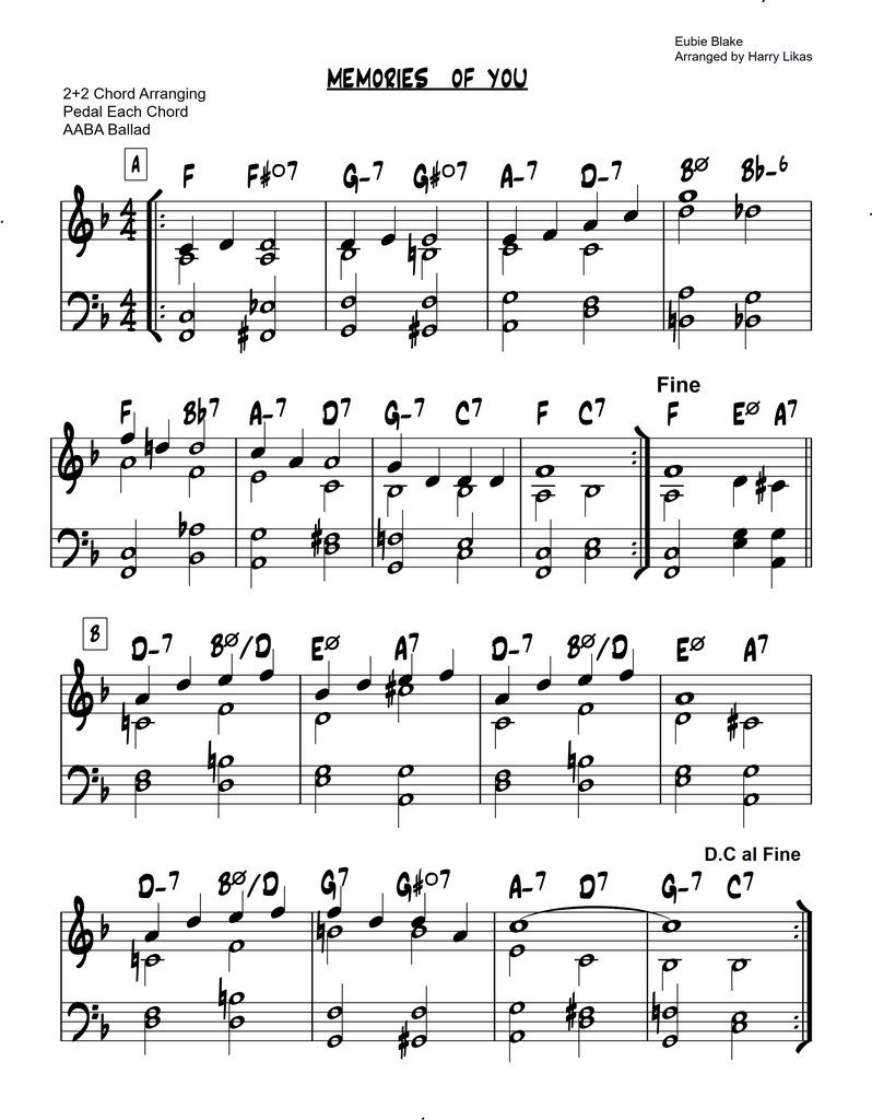 This is one of over 1,000 arrangements I’ve created, most of which follow the 2+2 chord arranging approach. These arrangements cover nearly every tune in The Real Book and adhere to a few simple rules, providing a strong foundation for players. For beginners and intermediate students, the 2+2 method offers a clear and manageable approach to chord arranging. By focusing on two notes in each hand, students can avoid the complexity of more advanced voicings and concentrate on developing their spontaneous voicing skills. This simplified approach builds confidence and encourages consistent practice, making it easier for students to progress and explore more complex arrangements over time. As students advance, they are encouraged to enhance their arrangements by adding notes and fills, allowing each piece to become uniquely their own.