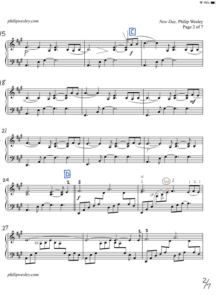 Here’s a piece I’m working on polishing right now, New Day by Philip Wesley. This piece is definitely on the easier side of the pieces I play, and it’s come together really quickly, so it’s maybe not representative of my “maximum playing ability” … but anyway, take a look: here’s the original, and one page from the score: