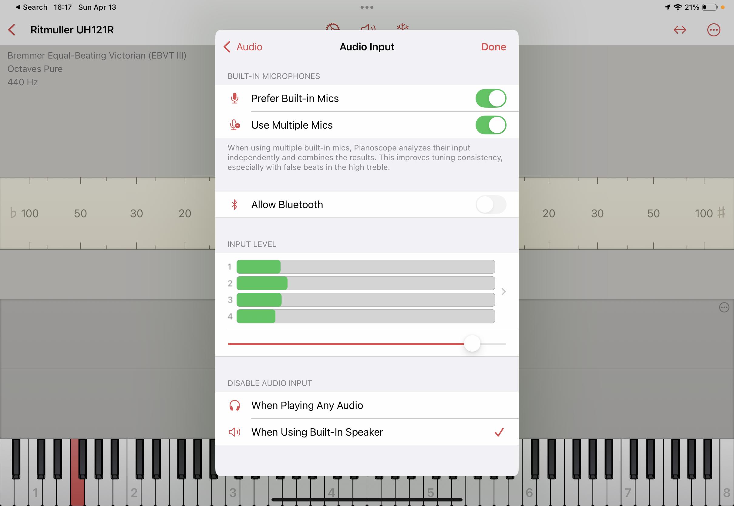 - Multi-Channel Audio Processing, pianoscope 3 can now process signals from multiple audio channels and seamlessly combine the results into its pitch display. The signals can come from external audio interfaces or from built-in microphones. Newer iPhones, such as the iPhone 15 Pro, feature four built-in microphones, while newer iPad Pro models have five. By enabling the new Use Multiple Mics switch, pianoscope utilizes multiple built-in microphones, analyzing their signals independently and merging the results. This enhances tuning consistency, particularly when dealing with false beats in the high treble.