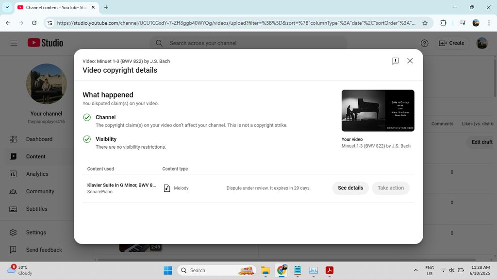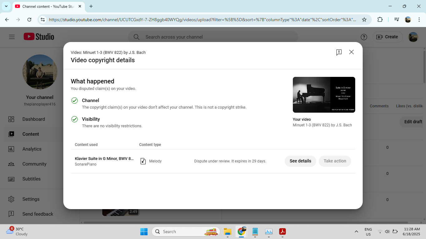The next screen asks you to pick 1 of 4 reasons: Original content, License, Copyright exception such as fair use & Public domain. When performing a piece of Classical music at least 100 years old, have to assume "Public domain" would be the most logical pick and type in your reason.