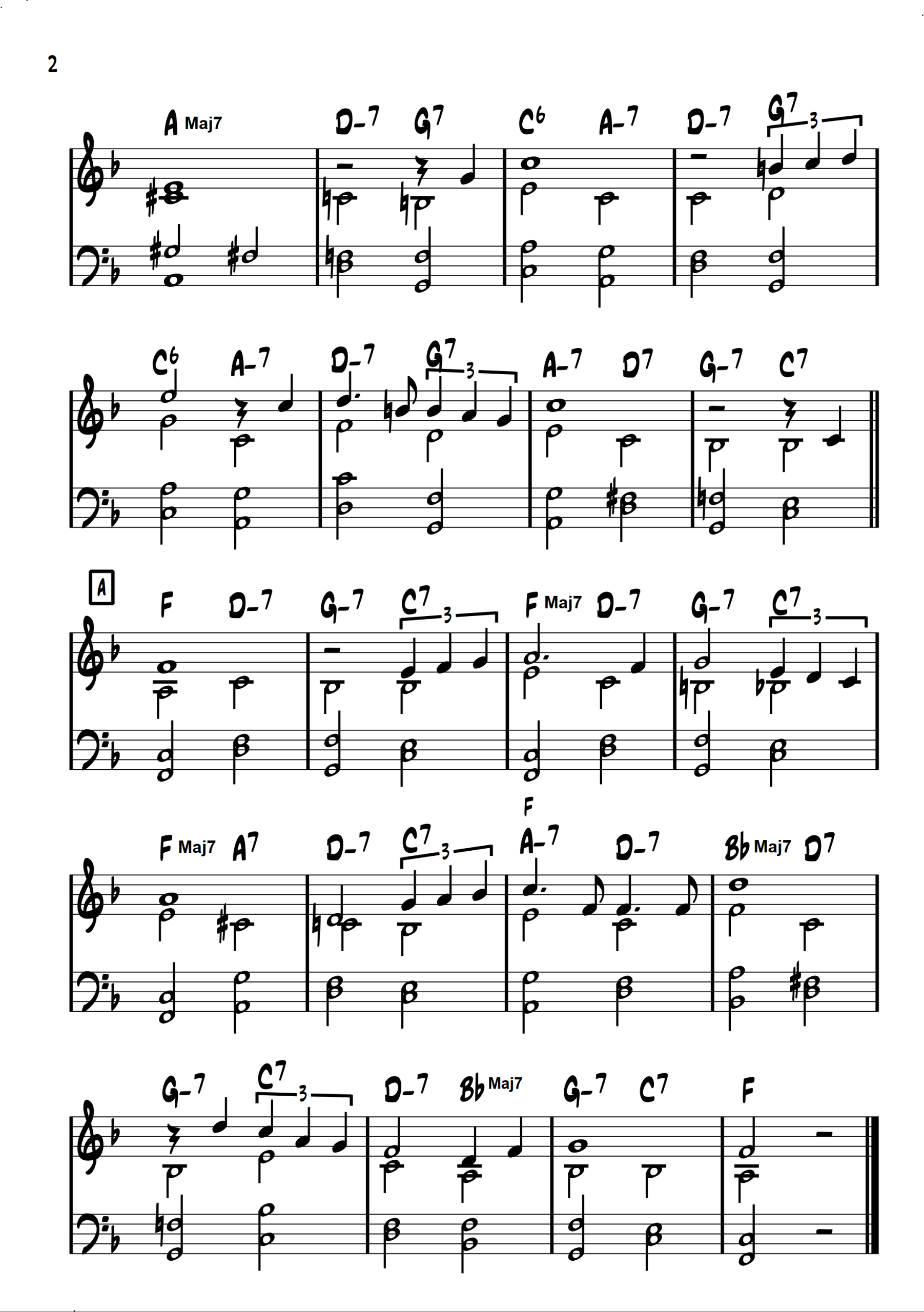 The 2+2 chord voicings make forming chords from chord symbols approachable. Each hand plays two notes. The left hand anchors the harmony—either the root and 7th, the root and 3rd, or the root and 5th on tonic chords. In the right hand, the thumb plays the chord tone that completes the harmony (either the 3rd or 7th), while the remaining fingers carry the melody above it.