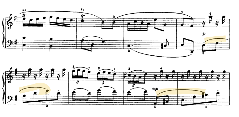 4 time, and is 44 measures long. It follows the pattern of modulation from tonic to dominant in the first section, with a ten bar central section before the recapitulation of the original material in G major. The movement is lively and has a two-voice texture. It presents rhythmic challenges such as triplets surrounded by duplets and off-beat patterns, and also features contrapuntal lines and sixteenth note triplets. The second movement is a minuet without the trio, in standard 3/4 time, and is a brief 16 measures in length. It has rhythmic complexity; in the first four measures half notes, quarter notes, eighth notes, eighth note triplets and sixteenth notes are all encountered. The third movement is a short, 9 measure andante in common time, where the first half of the piece is composed of four bars which are repeated once, and the second half comprises five bars which are also repeated. It is melodic and well balanced and also features contrapuntal lines. The allegro finale is in 3