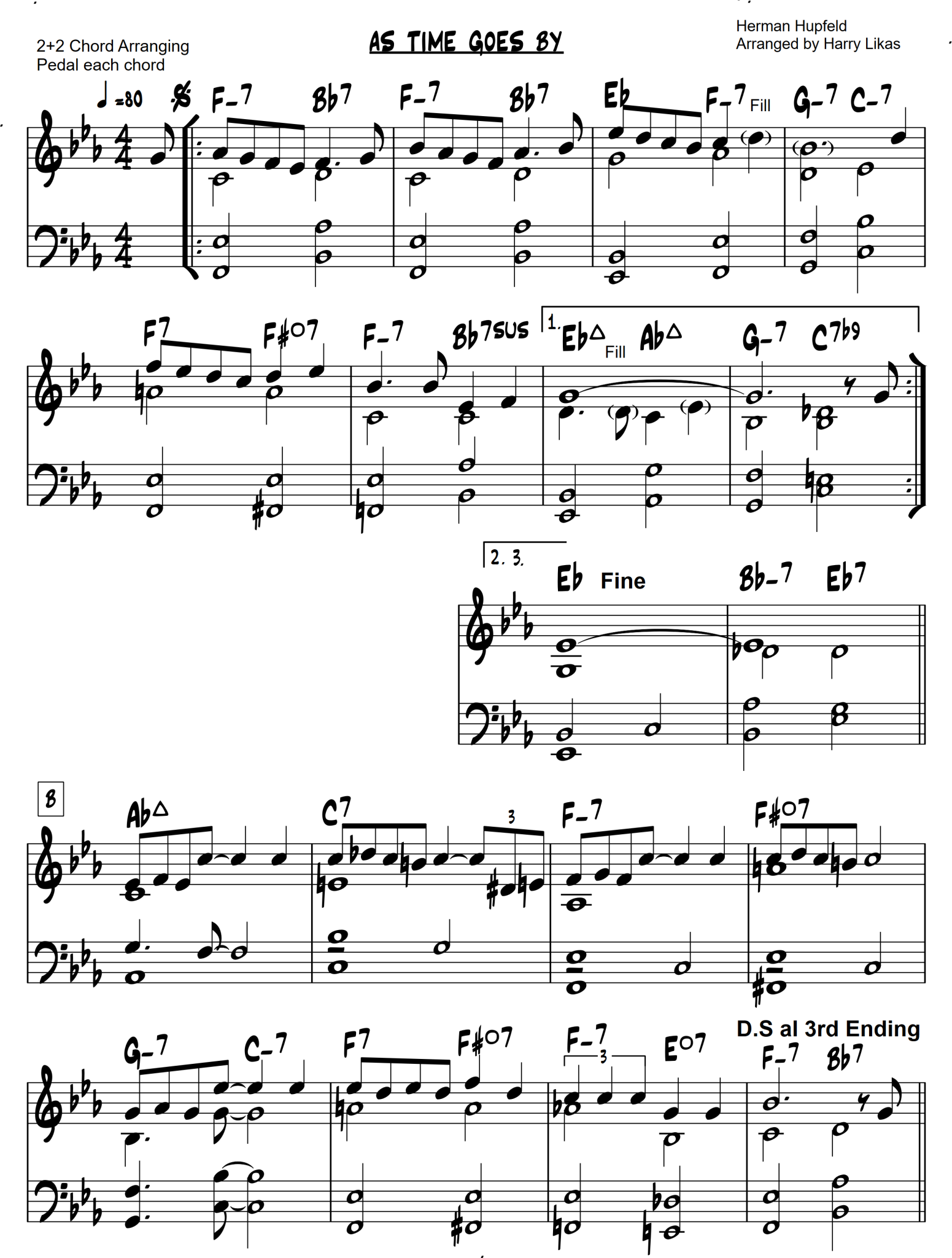 I’ve arranged “As Time Goes By” using my 2+2 chord method for solo piano. This classic, made famous by the film Casablanca, is cherished for its nostalgic melody and timeless message about enduring love. A staple of jazz and popular music, it has been recorded by countless artists—from Billie Holiday to Frank Sinatra.