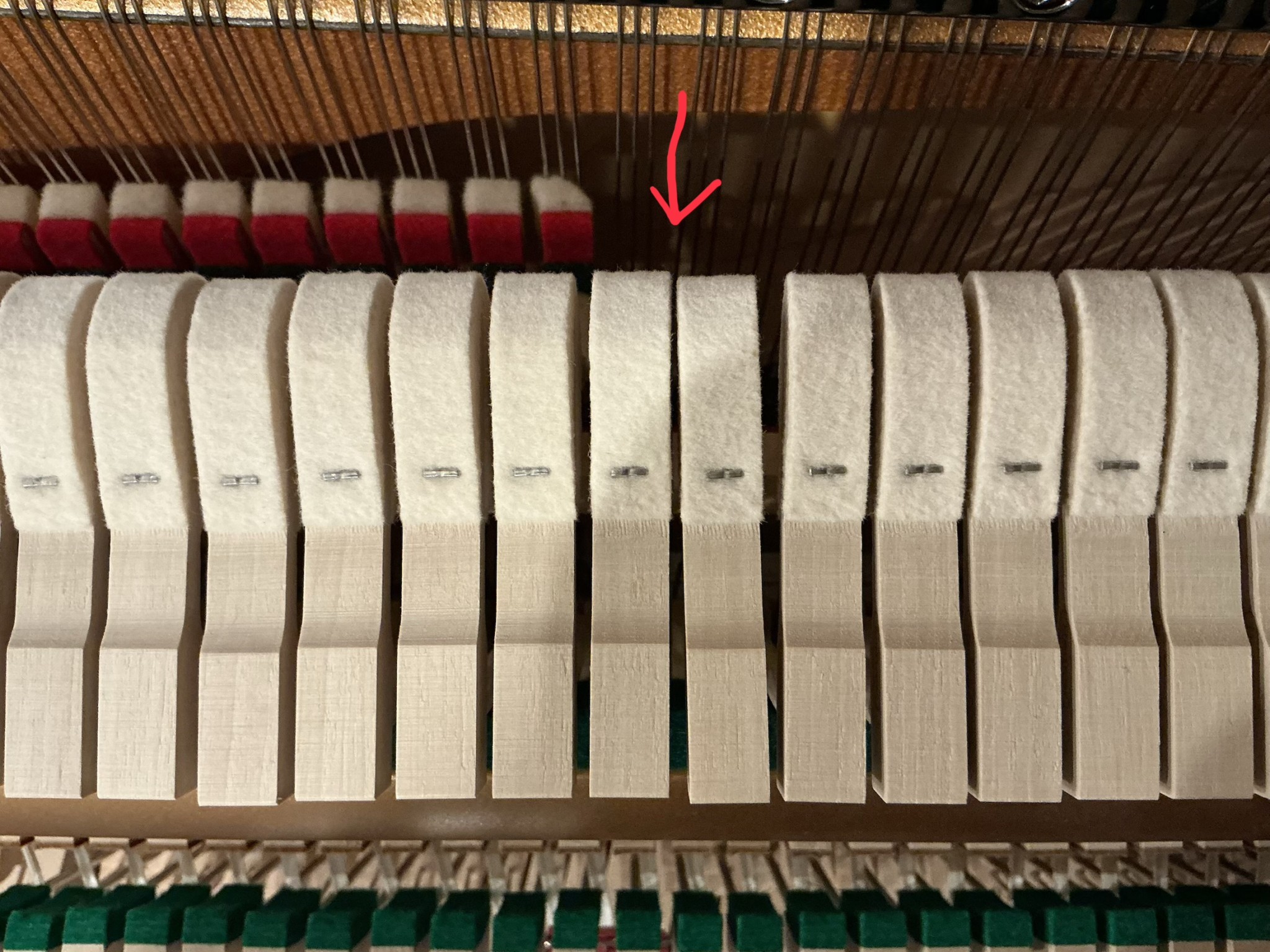 Next idea? Look up YouTube videos, discover these things called backcheck screws which are nearly impossible to see and equally impossible to reach. But it looks so easy on YouTube! Try to reach the backcheck screw anyway, and nearly destroy the piano in the process.