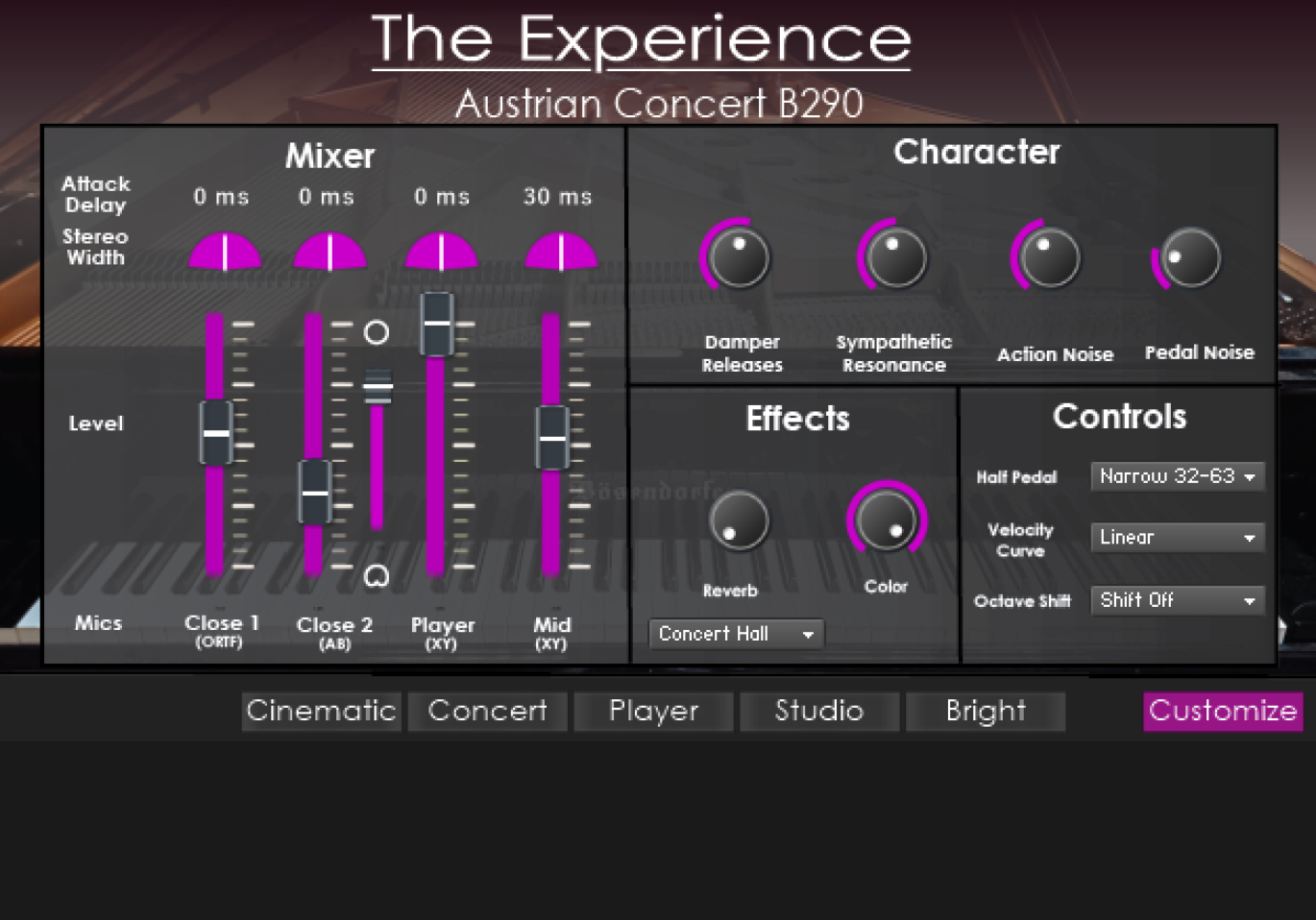 4 mic positions (two close (one of which is a condenser with the option to change the pattern), one just outside the instrument, one close to the instrument, a long with the option to change the volume of the mics and add a delay of up to 50ms. A very nice and authentic sympathetic resonance, some great action/pedal sounds.