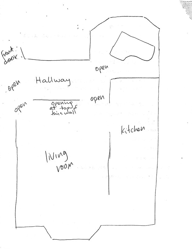 BTW, this is a very hastily drawn sketch meant to show how the piano room flows into the living room. It's very open, when sitting at the piano, I can see into the living room. Also, where it says "opening at top," that's a divider wall that basically blocks the entryway from the living room. (ETA I just realized the front door isn't in the right spot here, but that's ok)