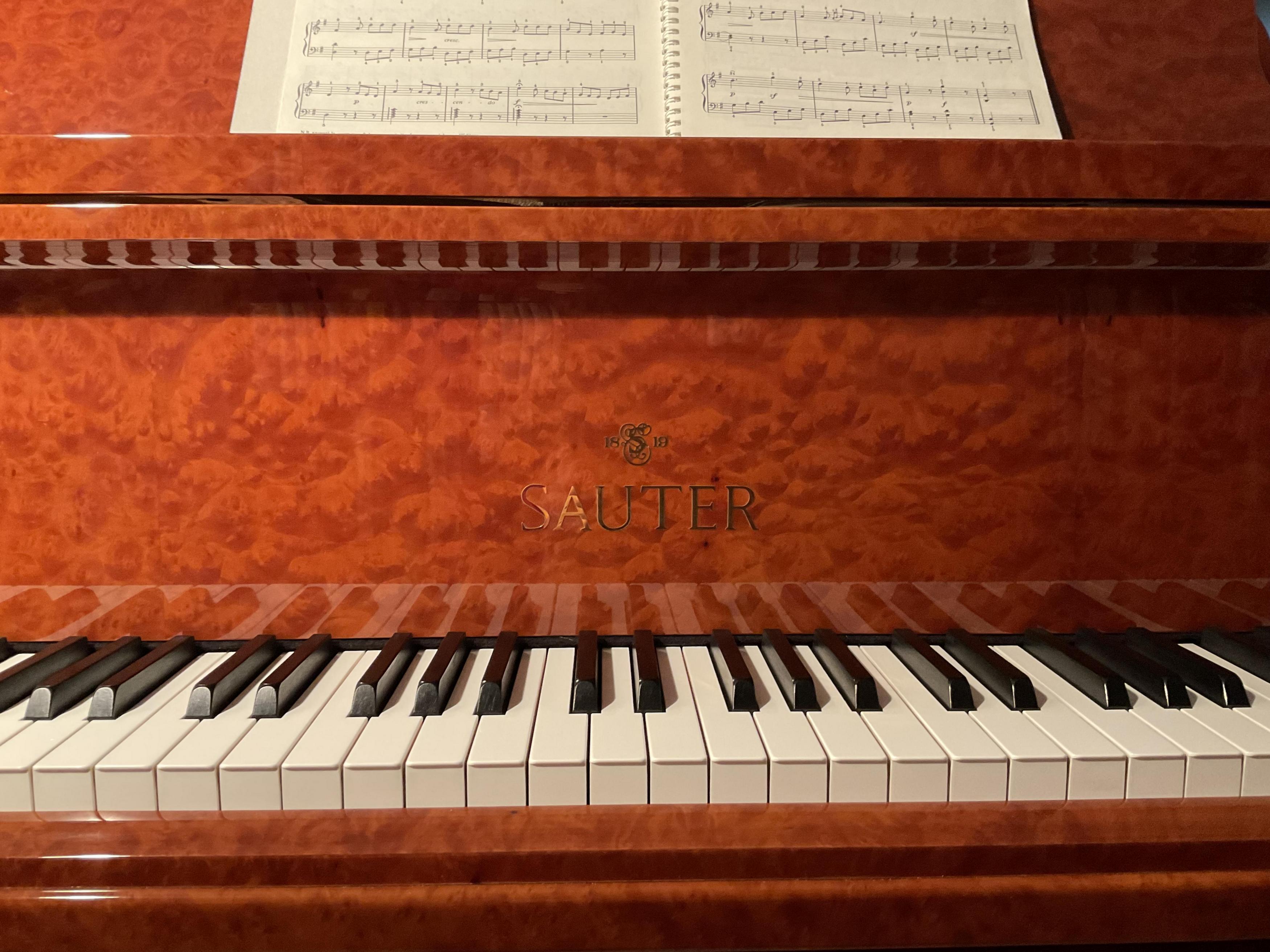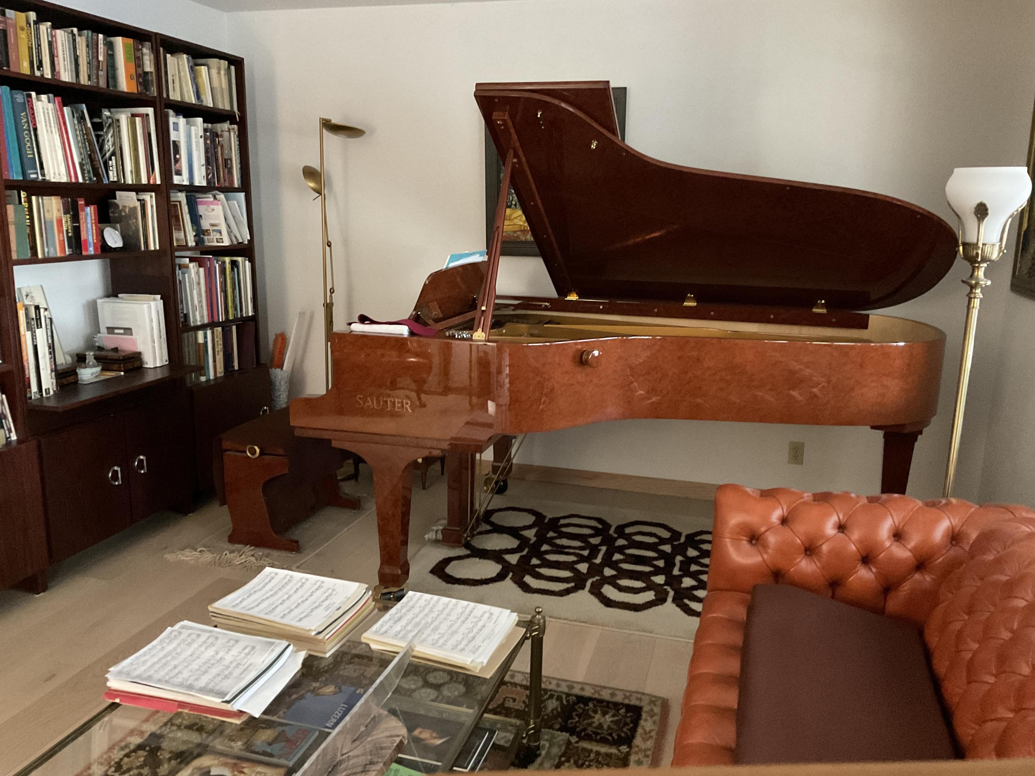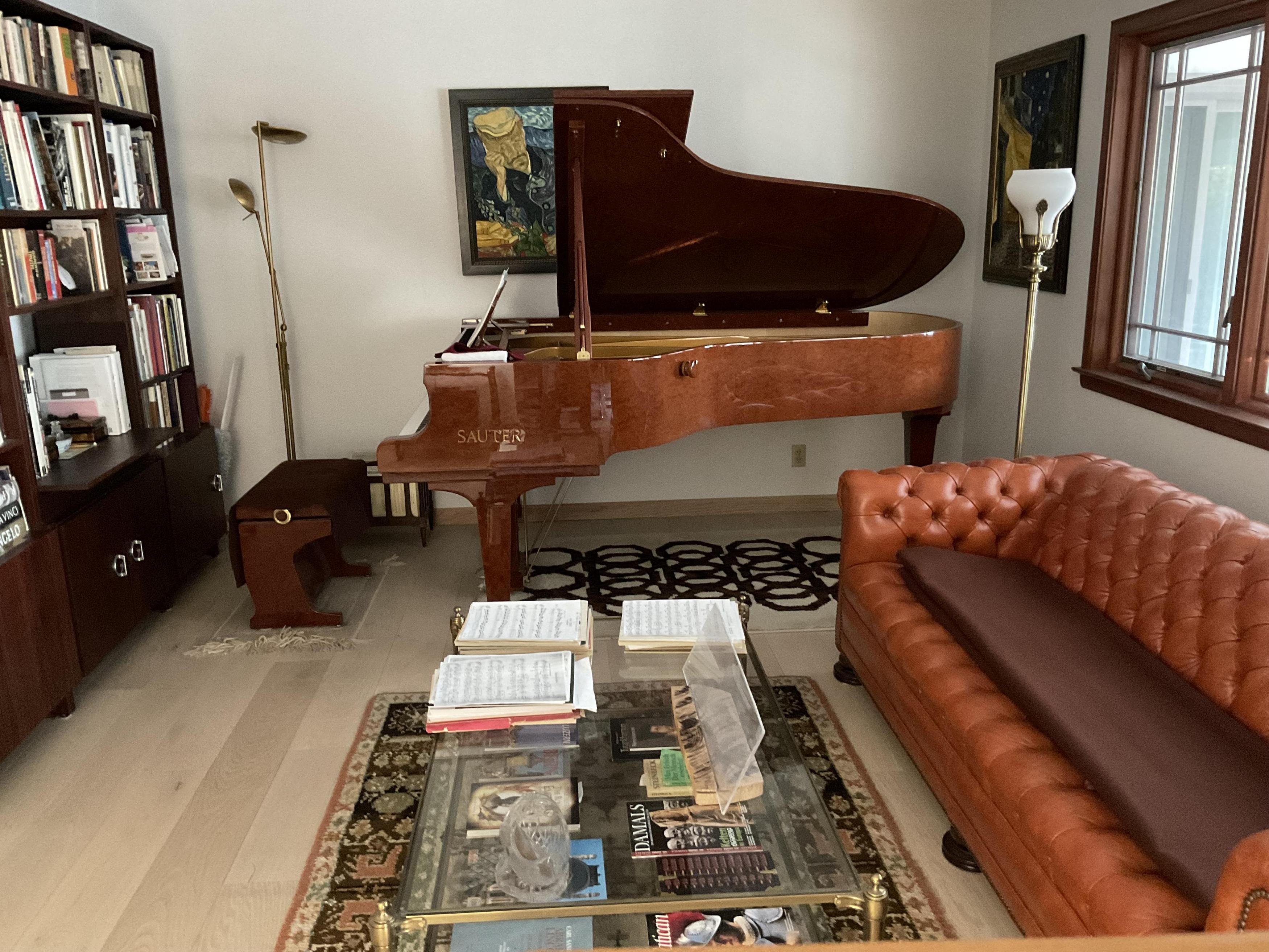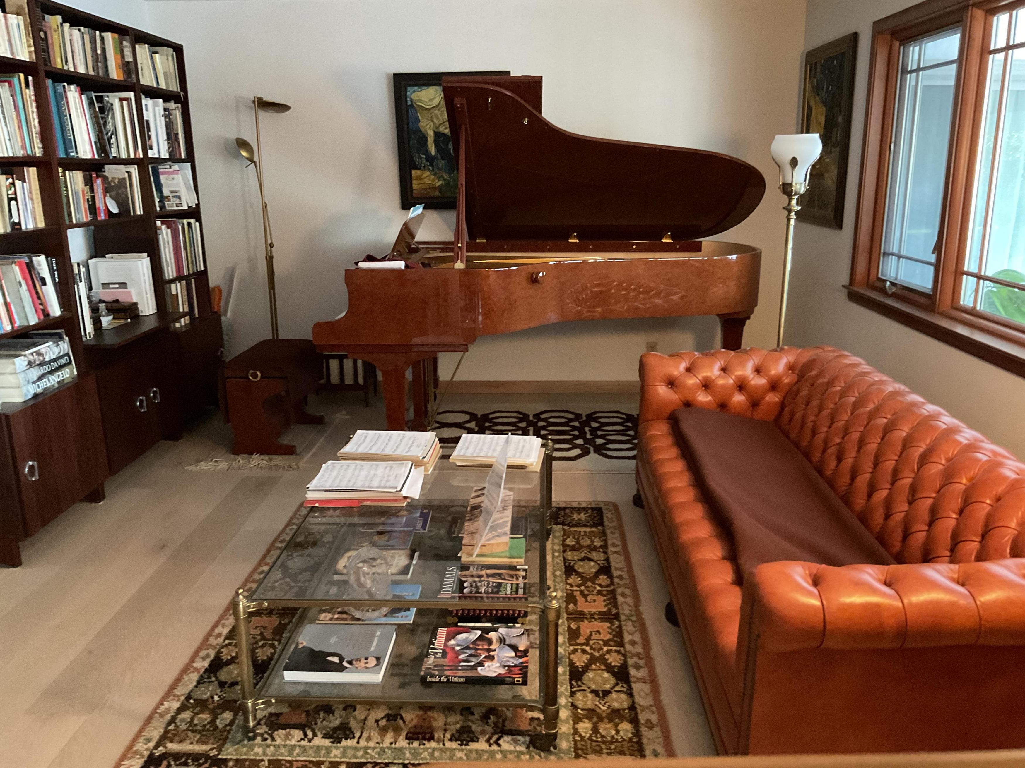 Also out of view is a large TV/console at the far end where the kitchen counter ends and the sofa seating area begins. The window end of the room was another option for putting the piano, with the main concerns being afternoon sun exposure from SW-facing windows, greater exposure to outside temp/humidity fluctuations with the balcony door, and not being sure where to put the TV.