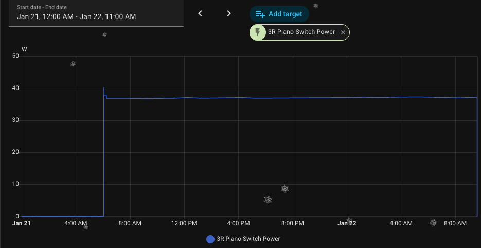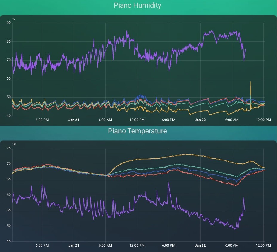In the below picture, you can see the yellow line drop below the standard trend, a little after 6pm on Jan 21, and the gap was getting wider. The blue line is also below the soundboard but positioned at the action/lyre, the pink line is above the soundboard at the hammers. The purple standing out on its own is the outdoor humidity/temp.